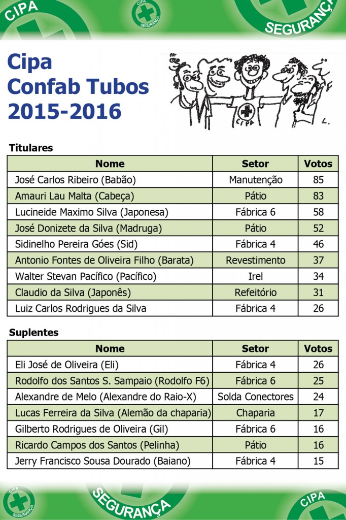 O mais votado foi o companheiro José Carlos Ribeiro, o “Babão”, da Manutenção, que conseguiu sozinho 85 votos. Em 2013, ele também foi o mais votado da Cipa. Em entrevista para o jornal O Trabalhador, ele agradeceu o reconhecimento dos colegas.