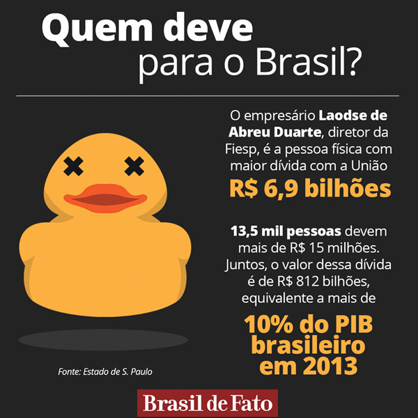 Com uma dívida maior que a dos governos da Bahia, Pernambuco e outros 16 estados, o empresário Laodse de Abreu Duarte, um dos diretores da Federação das Indústrias do Estado de São Paulo (Fiesp), é a pessoa física que mais deve aos cofres públicos do Brasil.