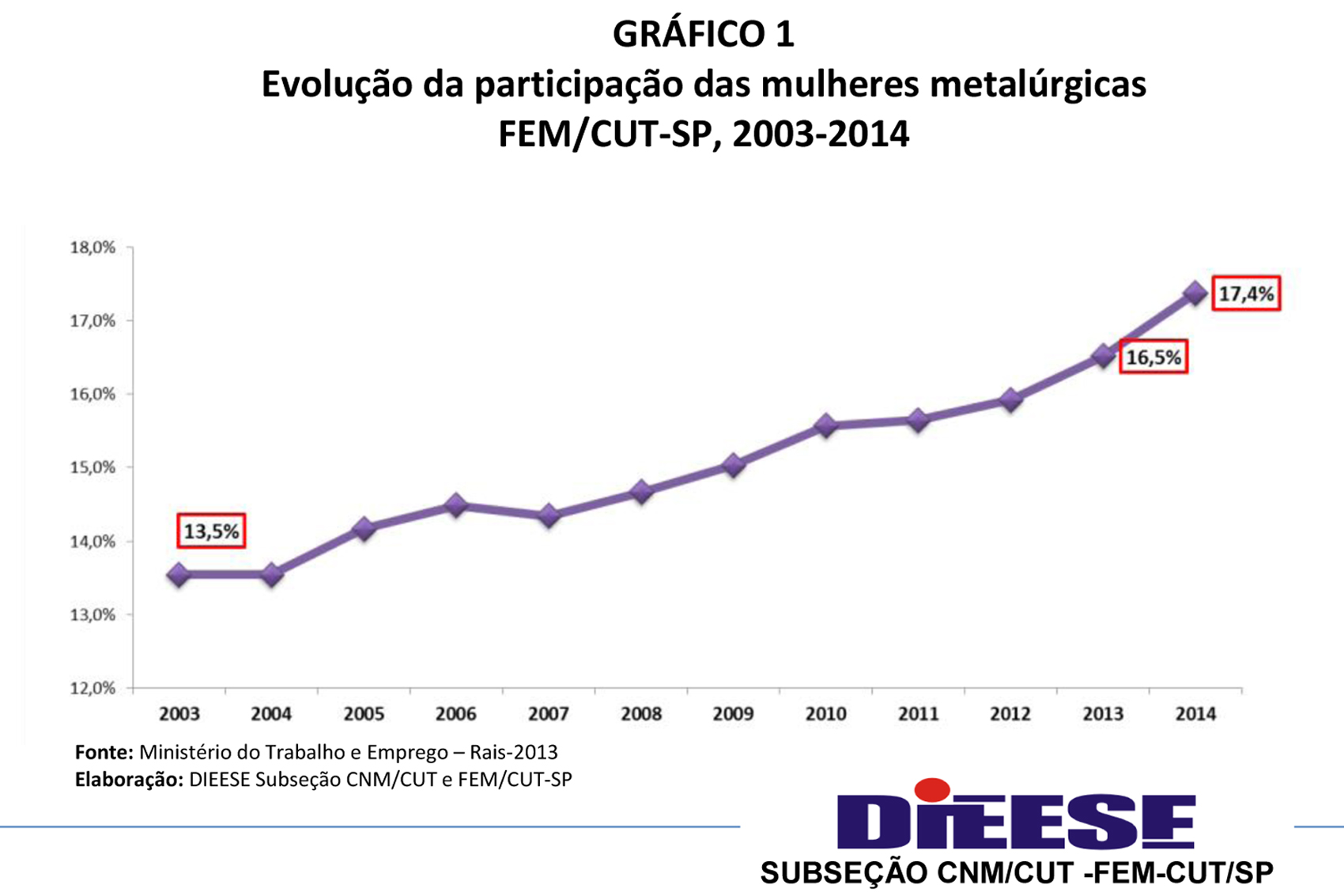 A participação das mulheres metalúrgicas no mercado de trabalho vem crescendo a cada ano no Estado. Na base da Federação dos Sindicatos Metalúrgicos da CUT (FEM/CUT-SP), elas aumentaram de 16,69% em 2013 para 17,4% em 2014, totalizando 43 mil. Os homens lideram com 205 mil. Os dados são do Ministério do Trabalho e Emprego, RAIS 2013 e CAGED 2014.