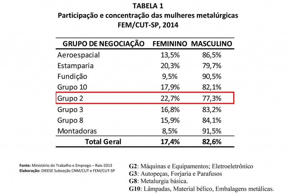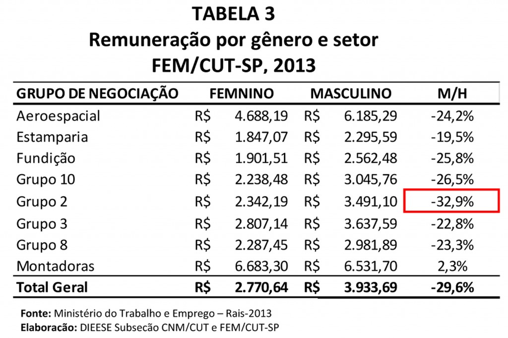 Na base da FEM/CUT-SP, as mulheres recebem em média 29,6% a menos que os homens. A maior diferença também se encontra no Grupo 2 (Máquinas e Equipamentos; Eletroeletrônico), onde elas estão concentradas, chegando em média a 32,9%.