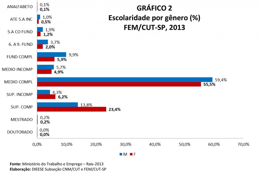 As mulheres da base da FEM/CUT-SP têm mais tempo de estudo que os homens, 23,4% delas possuem no mínimo graduação de nível superior, enquanto os homens apenas 13,8% possuem ensino superior completo.