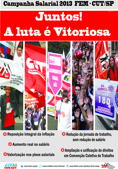 A FEM-CUT/SP divulgou aos dirigentes e presidentes dos 14 sindicatos metalúrgicos filiados no Estado o novo Cartaz da Campanha Salarial (imagem acima). O anúncio aconteceu durante reunião da Direção Plena da Federação, ocorrida na quarta-feira, 26, na sede da entidade, em São Bernardo do Campo. A data-base da categoria é 1º de setembro e cerca 206 mil metalúrgicos estarão em Campanha.
