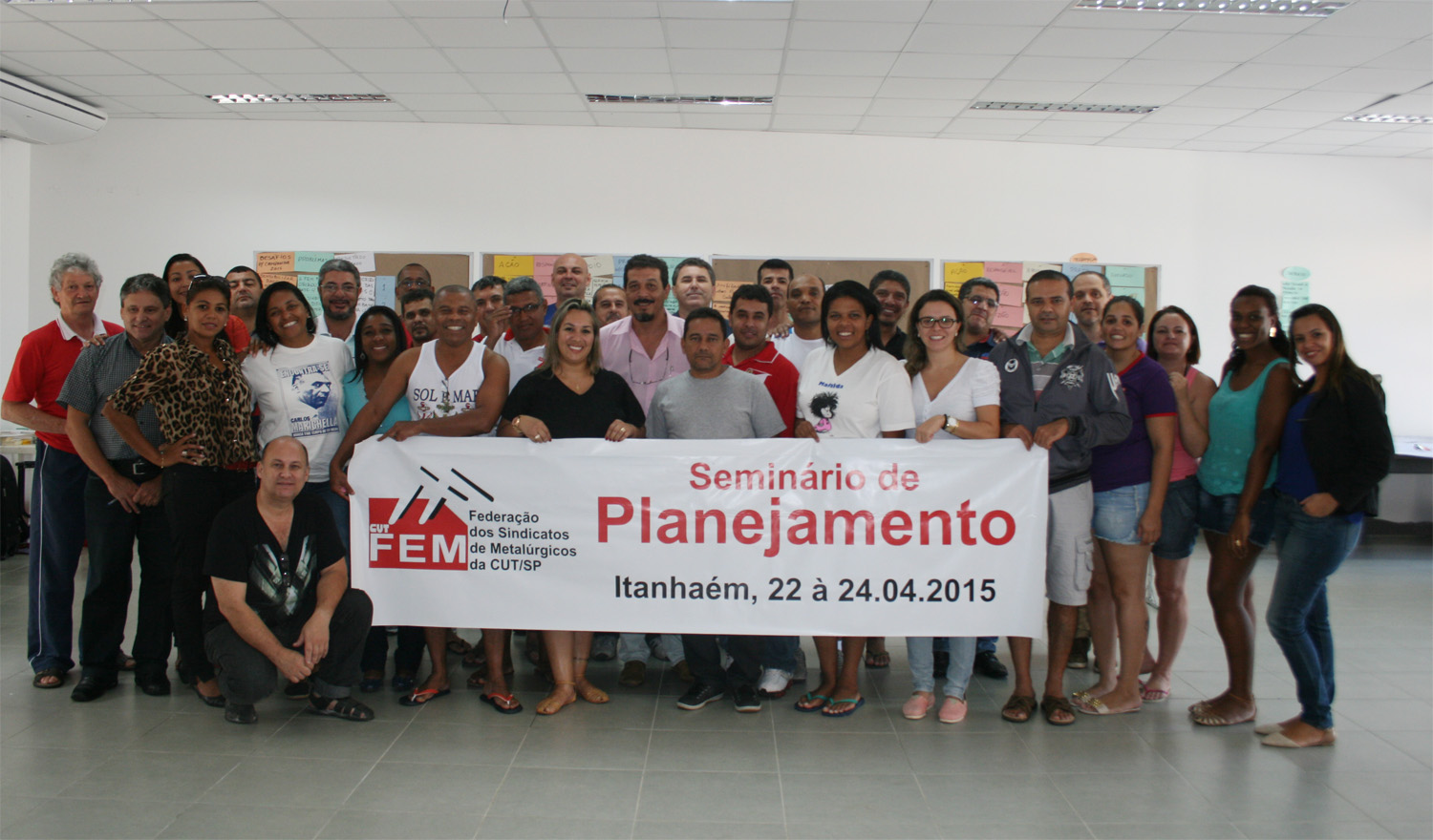 A nova Direção da Federação dos Sindicatos Metalúrgicos da CUT/SP (FEM-CUT/SP) aprovou os preparativos da Campanha Salarial 2015 em Seminário de Planejamento, ocorrido do dia 22 a 24 de abril, na Colônia de Férias da entidade, em Itanhaém, litoral sul paulista. O evento foi ministrado pelo educador e assessor da CNM/CUT, Fernando Cardoso, o popular Guaru, pelo assessor político da FEM, Paulo Vanucchi e pela economista e técnica da Subseção do Dieese na FEM-CNM/CUT, Caroline Gonçalves. Participaram dirigentes dos 14 sindicatos metalúrgicos filiados no Estado.