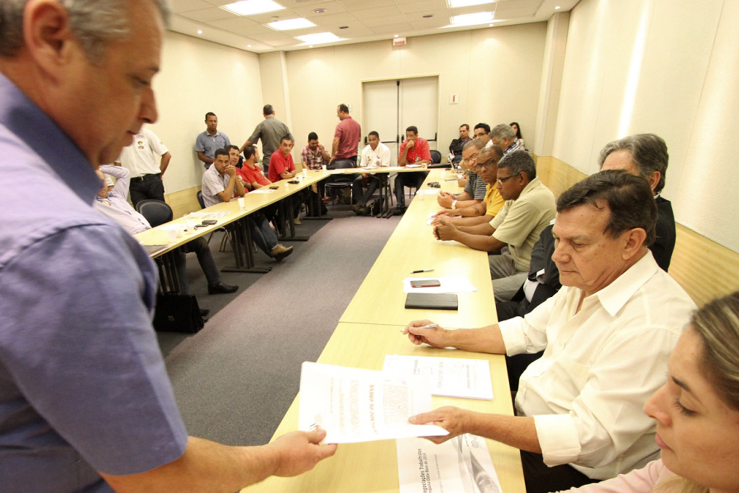O presidente da FEM-CUT/SP, Valmir Marques da Silva (Biro-Biro), entrega à bancada patronal o comunicado de greve (Foto: Adonis Guerra)