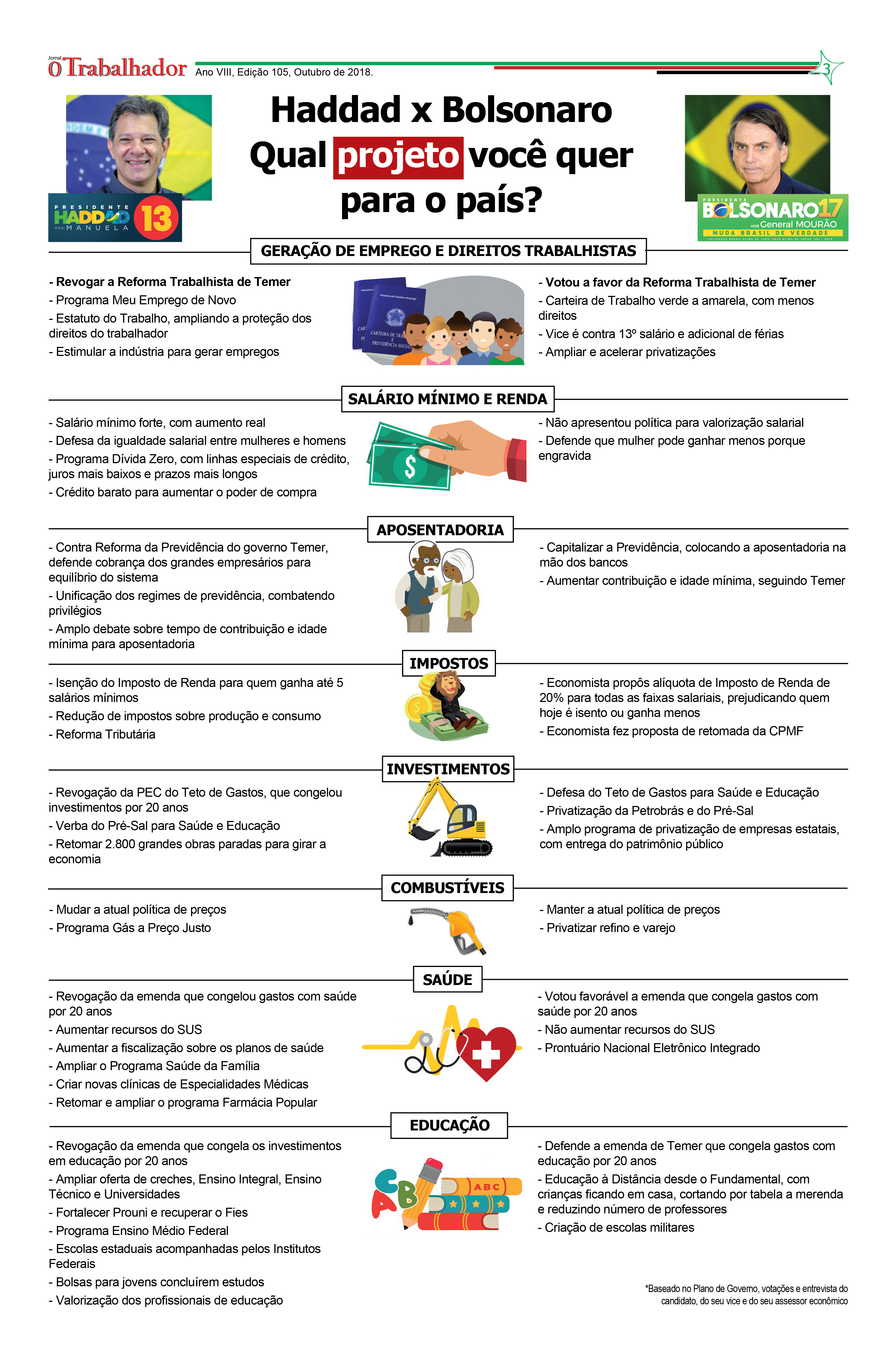 Haddad x Bolsonaro: Qual projeto você quer para o país? outubro 25, 2018 Veja o comparativo dos planos de governo de Fernando Haddad e Jair Bolsonaro; leia, reflita e decida qual candidato melhor representa os interesses do povo brasileiro