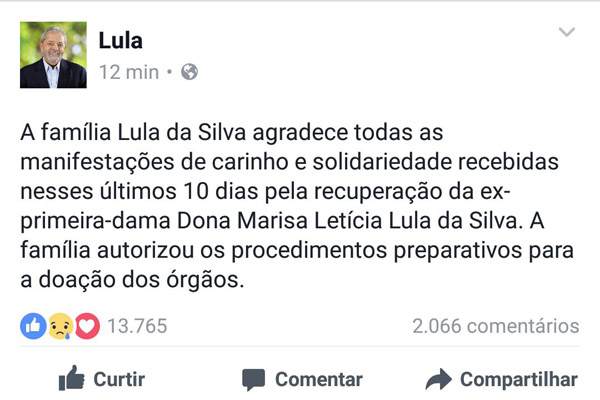 Em sua página no Facebook, o ex-presidente Luiz Inácio Lula da Silva agradeceu as manifestações de carinho e solidariedade durante a internação de Marisa Letícia durante os últimos dias. Marisa Letícia foi internada no dia 24 de janeiro, quando sofreu um acidente vascular cerebral.