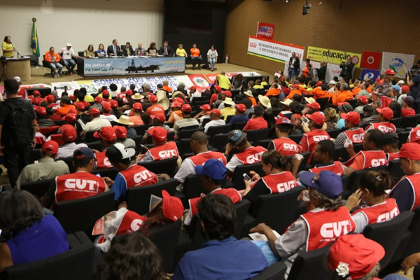 Com macacões cor de laranja da Petrobrás e coletes vermelhos da CUT, homens e mulheres de todo o país lotaram o auditório Nereu Ramos, da Câmara dos Deputados, na terça-feira (14), para reafirmar o compromisso de trabalhadores, estudantes e movimentos sociais com a soberania nacional e a democracia.