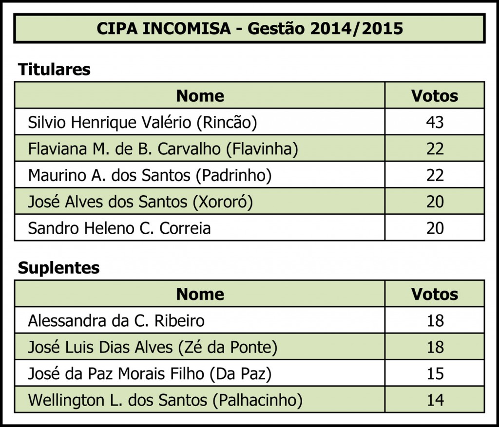 Os trabalhadores da Incomisa elegeram no dia 13 de maio os novos membros da Cipa (Comissão Interna de Prevenção de Acidentes).