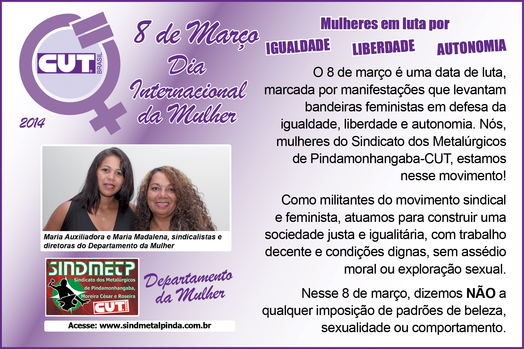 Veja abaixo o cartão do Sindicato dos Metalúrgicos pelo Dia Internacional da Mulher: