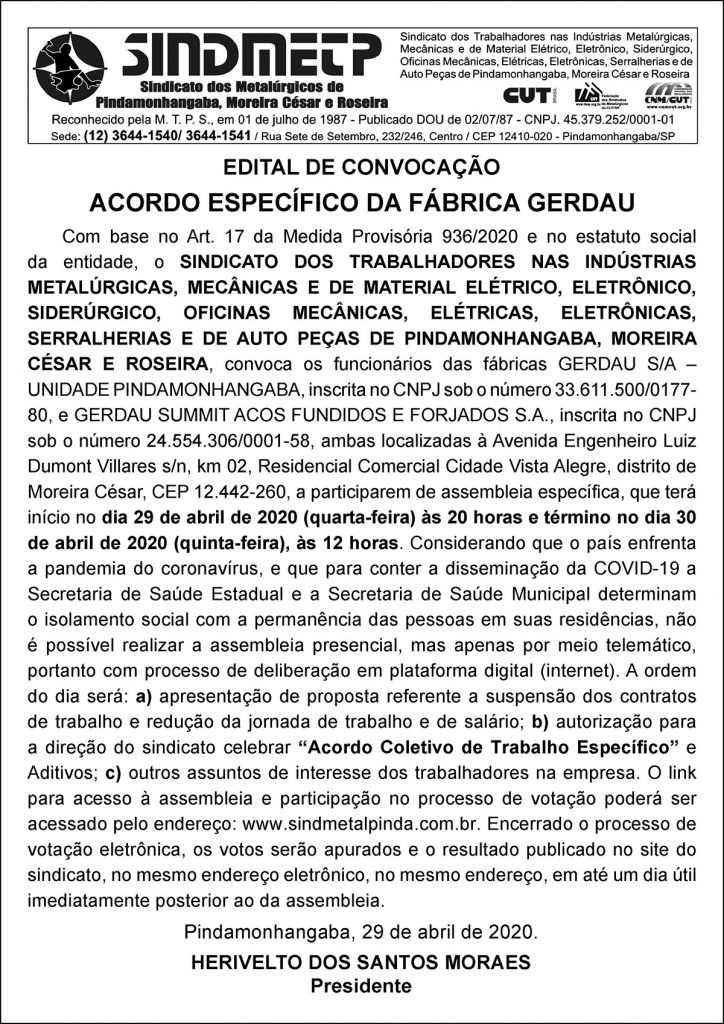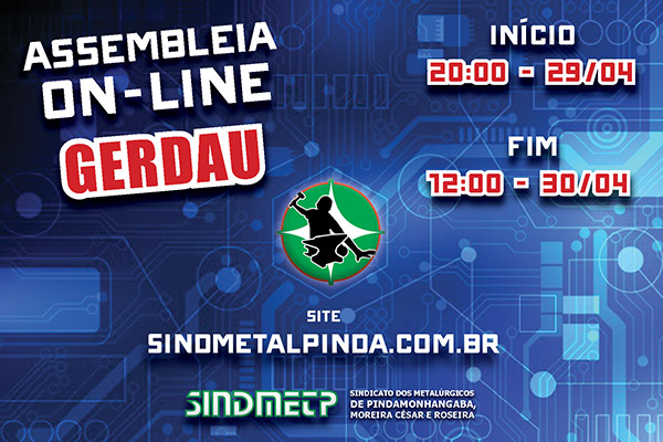 O Sindicato dos Metalúrgicos de Pindamonhangaba está convocando os trabalhadores da fábrica Gerdau para participarem de uma assembleia eletrônica.