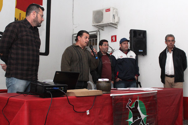 Ao microfone, o dirigente Celso Antunes, que já foi secretário de Formação do sindicato