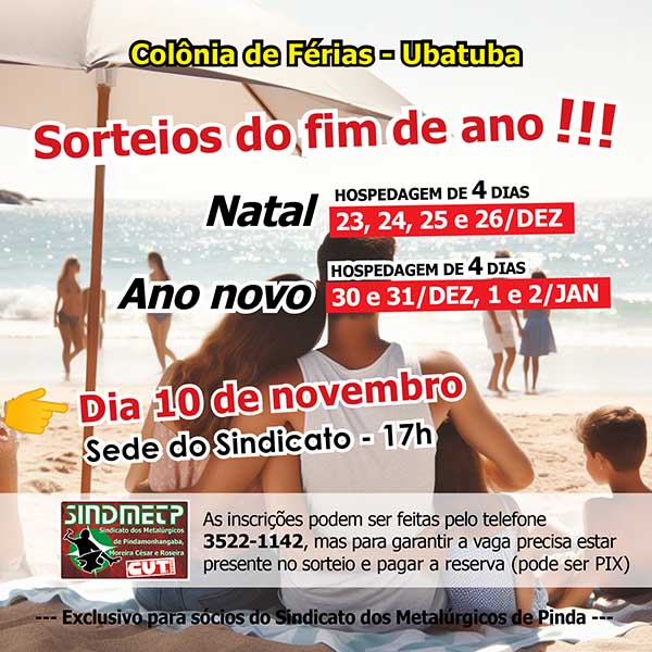 As inscrições para o sorteio de fim de ano da Colônia de Férias do Sindicato dos Metalúrgicos estão abertas.