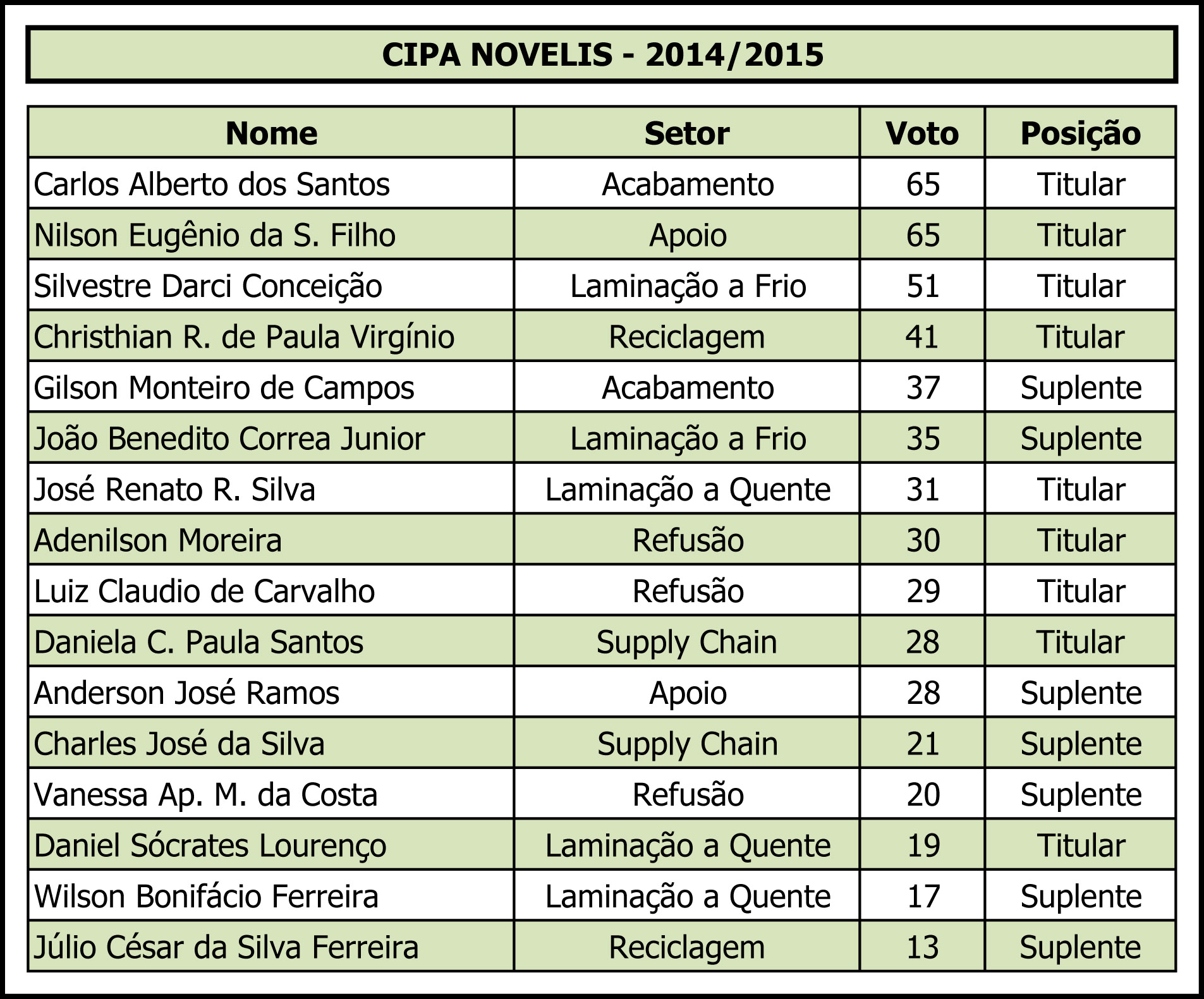 Os trabalhadores da Novelis elegeram nos dias 12 e 13 de março os novos membros para a Cipa (Comissão Interna de Prevenção de Acidentes) gestão 2014-2015.