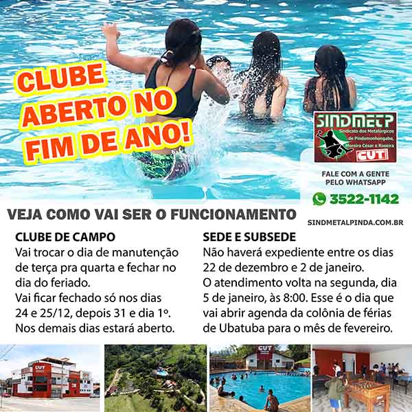 Na sede e na subsede do sindicato não haverá expediente entre os dias 22 de dezembro e 2 de janeiro. Quem quiser levar convidados no clube nesse período deve solicitar isso por mensagem para o Whatsapp 3522-1142.