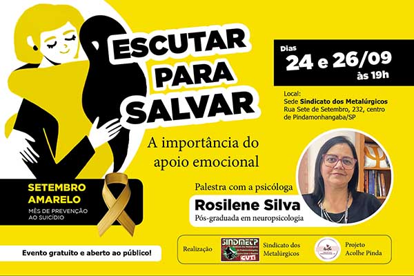 A palestra “Escutar para salvar: A importância do apoio emocional”, será realizada nos dias 24 e 26 de setembro, às 19h, na sede do sindicato, que fica localizada Rua Sete de Setembro, 232, centro. O evento é gratuito e aberto ao público.