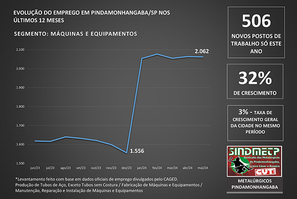 Segundo levantamento do Sindicato com base nos dados do Caged, o segmento de Máquinas e Equipamentos apresentou um crescimento de 32% no volume de emprego na cidade. Apenas este ano foram gerados 506 novos postos de trabalho.