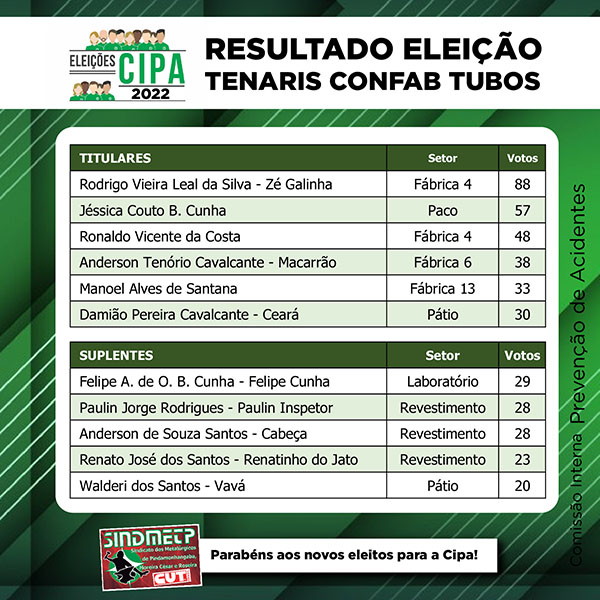 Os trabalhadores da Tenaris Confab Tubos elegeram nos dias 10 e 11 de fevereiro os novos membros da Cipa. A apuração ocorreu nesta manhã, o Sindicato fiscalizou todo o processo bem de perto ao longo desses 2 dias e tudo correu bem.