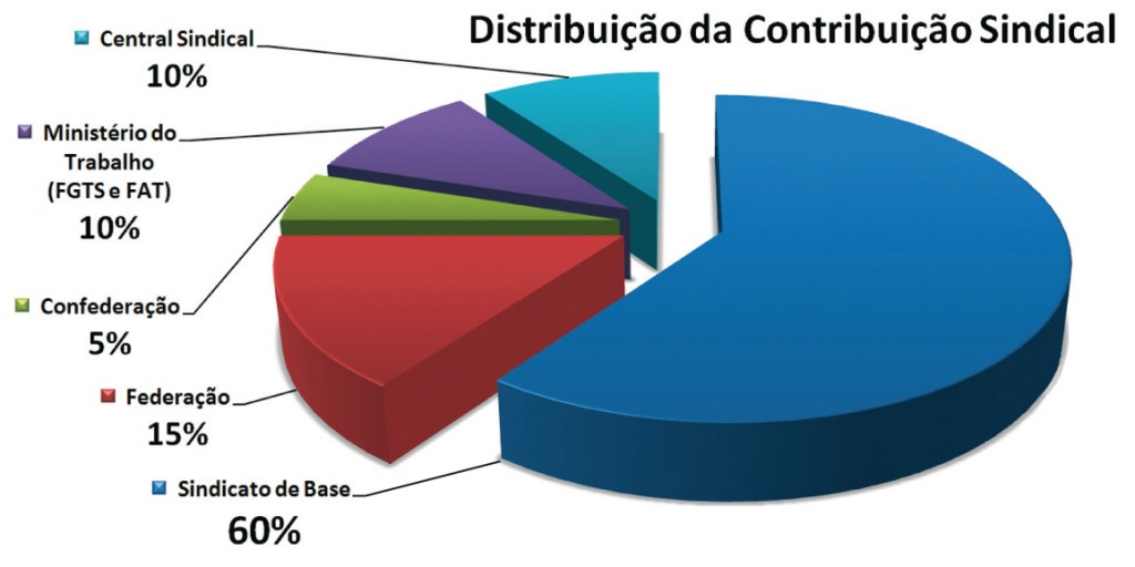 Do total descontado, 60% são depositados, após cerca de dois meses, na conta do respectivo sindicato; outros 15% para as federações de trabalhadores; 10% para o Ministério do Trabalho (Conta Especial Emprego e Salário); 10% para as centrais sindicais e 5% para as confederações.