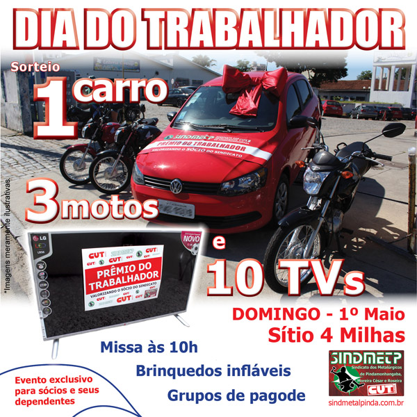 Dia do Trabalhador terá sorteio de 1 carro, 3 motos e 10 TVs