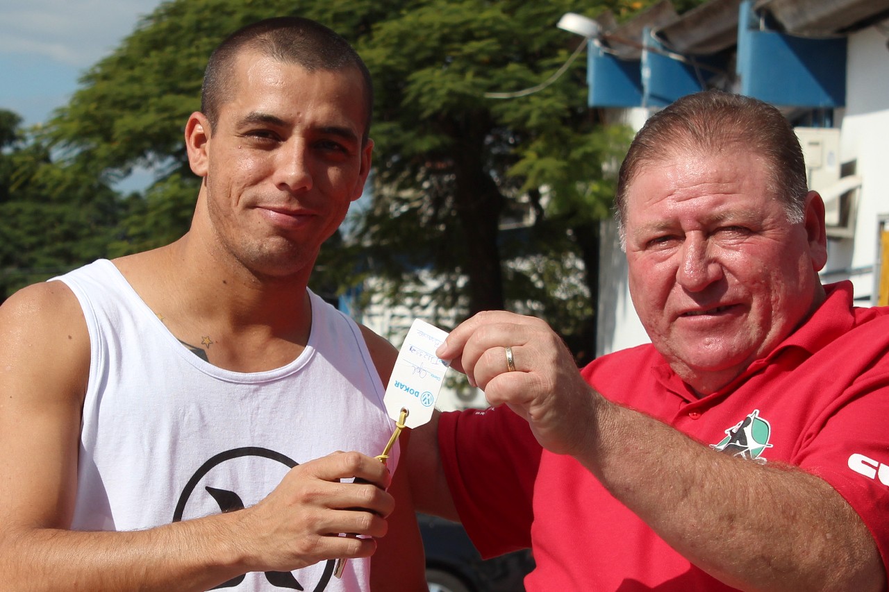 Renato Mamão entrega chave ao Guilherme, ganhador do sorteio do carro no ano passado