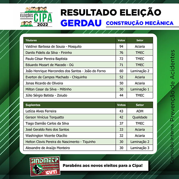 Os trabalhadores da Gerdau elegeram nos dias 17 e 18 de fevereiro a nova Cipa (Comissão Interna de Prevenção de Acidentes) no setor de Construção Mecânica.