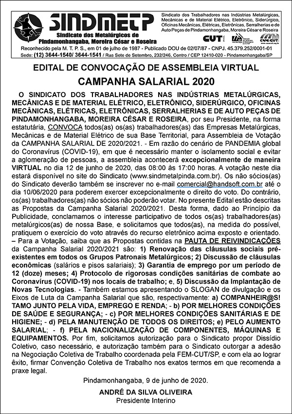 O Sindicato dos Metalúrgicos de Pindamonhangaba convoca todos os trabalhadores para participarem da assembleia geral da Campanha Salarial, que será realizada na sexta-feira, dia 12, de forma on-line, das 8h às 17h, no site da entidade.