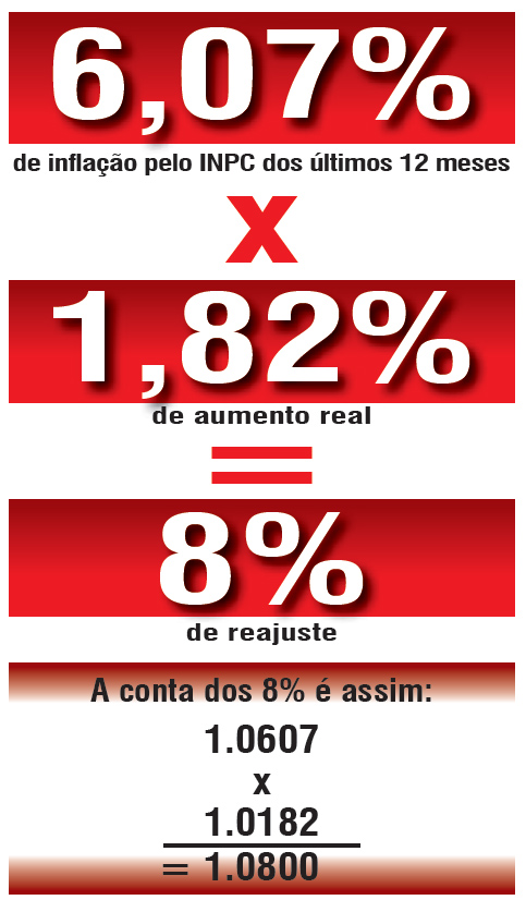 Além do aumento salarial de 8% (6,07% da inflação acumulada no período + 1,82% de aumento real – veja no quadro abaixo como é o cálculo do aumento), os trabalhadores receberão um abono salarial de R$ 1.400.