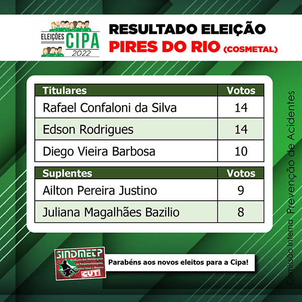 A direção do Sindicato parabeniza os novos eleitos e os trabalhadores pela grande participação. Ao total, foram 78 votos, mostrando que mais de 80% dos funcionários participaram. A Pires do Rio atua na trefilação e laminação e fica na estrada do Atanázio. Veja abaixo a relação dos eleitos:
