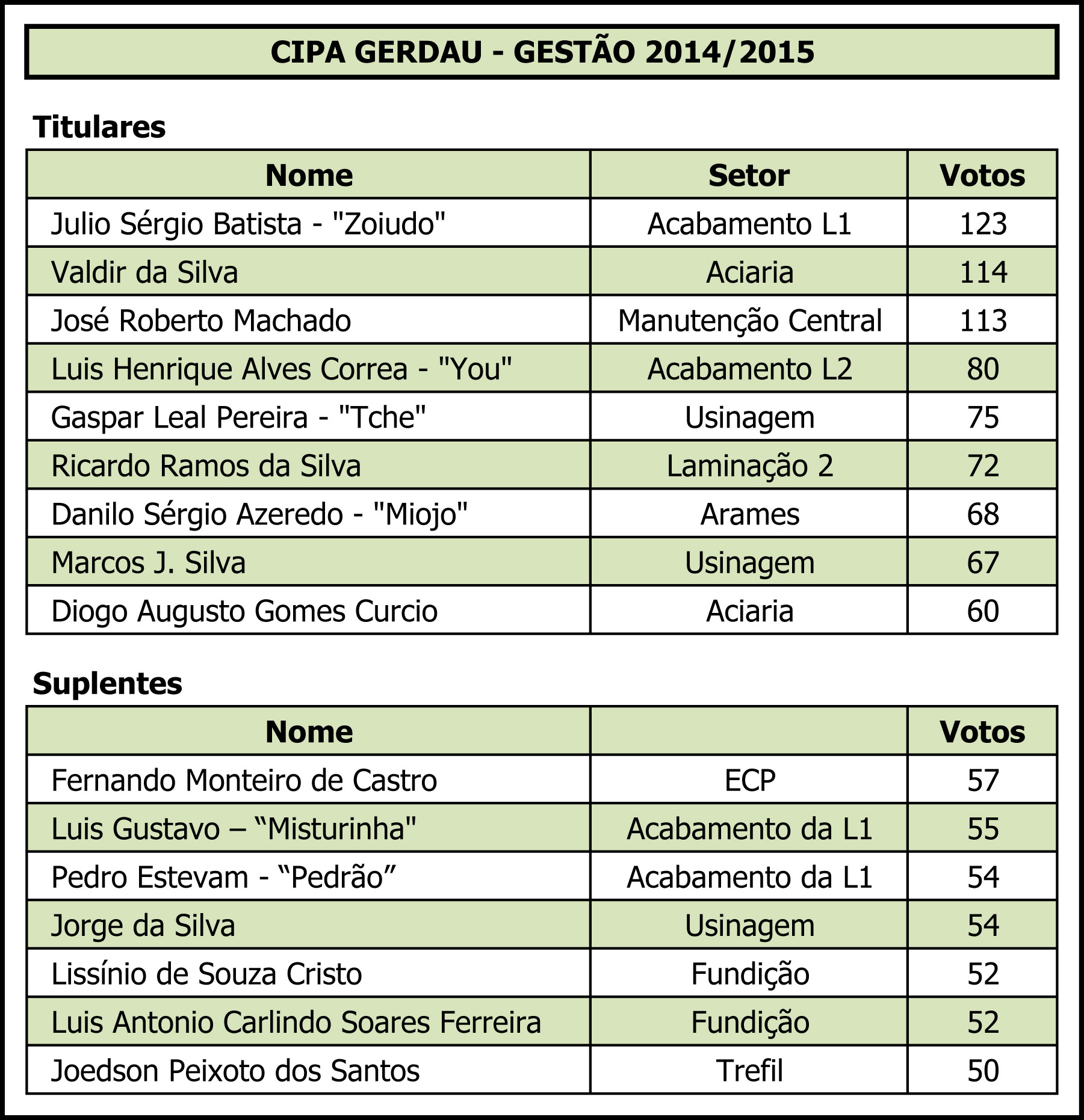 Os trabalhadores da Gerdau elegeram entre os dias 18 e 20 de fevereiro os novos membros para a gestão da Cipa (Comissão Interna de Prevenção de Acidentes) 2014/2015.
