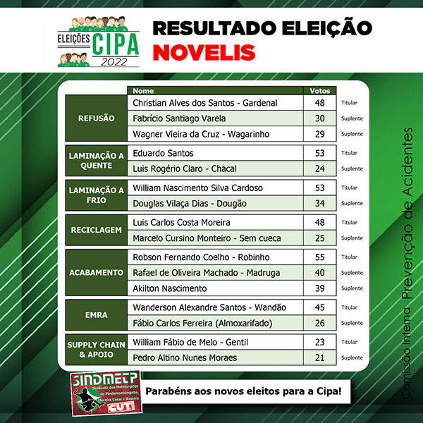 Os trabalhadores da Novelis elegeram nos dias 10 e 11 de março os novos membros para a Cipa (Comissão Interna de Prevenção de Acidentes).